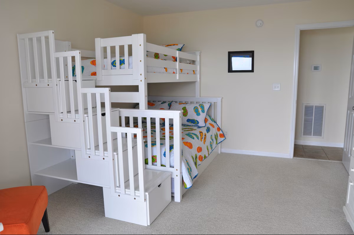 On the top floor you will find the master bedroom with a king-sized bed, comfortable living room, dining area and a fully-equipped kitchen all with fabulous views. Downstairs are 3 more bedrooms: 2 with queen-sized beds and the third with a great new twin over full bunk bed with pullout twin trundle to sleep all the kids.